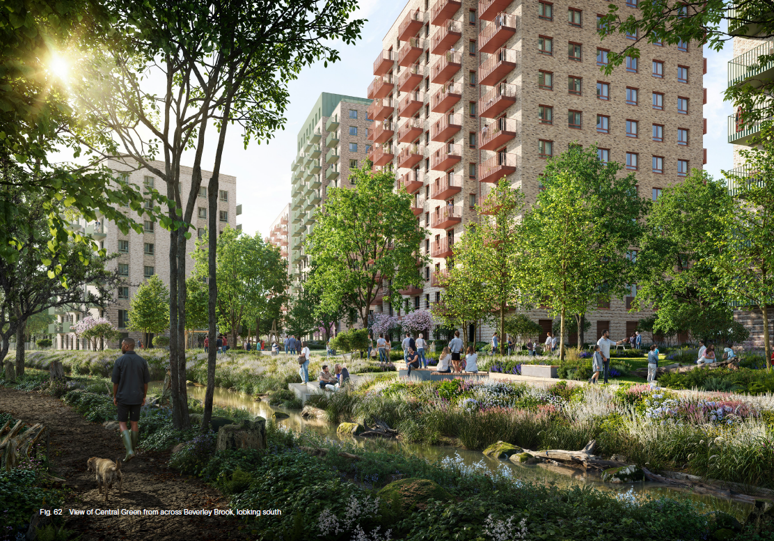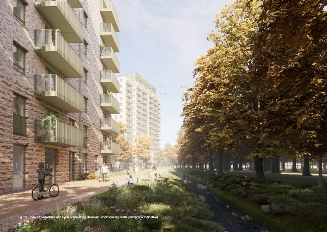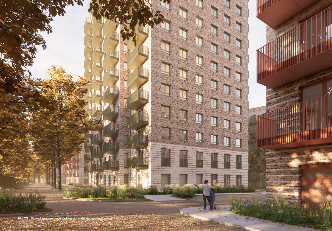 The proposal consists of 586 dwellings, in 5 tower blocks, 8-16 storeys high. Construction traffic will be a one-way-system, north-south. Post-construction, vehicle access is via the south only (Green Lane), with cycle / pedestrian acess to the north.