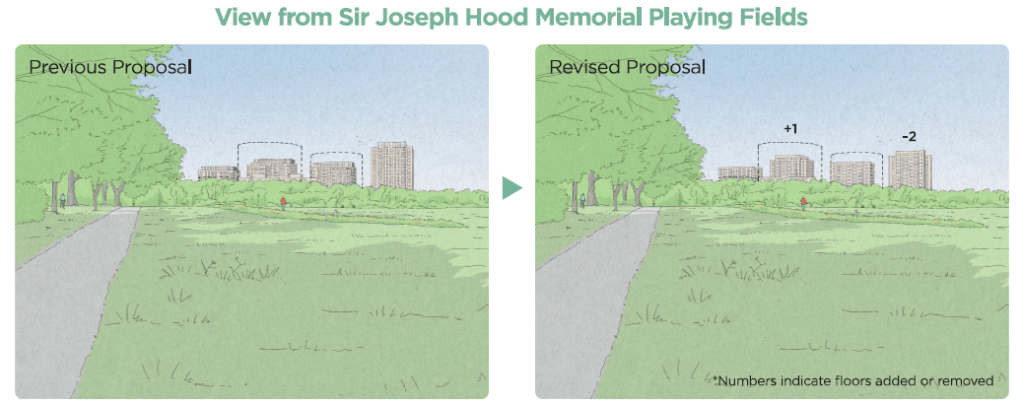 Many residents have commented that changing the height does little to address the impact on the visual character of the area. Both views are much the same, even with the revised proposals. Some residents queried the choice of views, and how many people experienced the gas holders from other vantage points. The ‘treeline’ has often been referenced as an appropriate height.